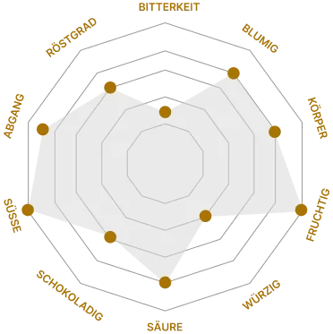 In der Tasse entfalten sich Aromen von Karamell, Milchschokolade, Haselnuss und braunem Zucker, begleitet von leichten Zitrusnoten und einer milden, ausgewogenen Säure.